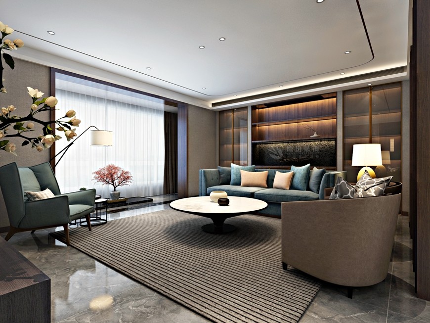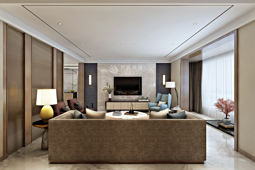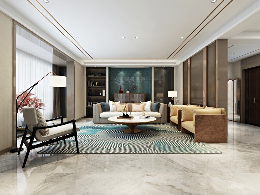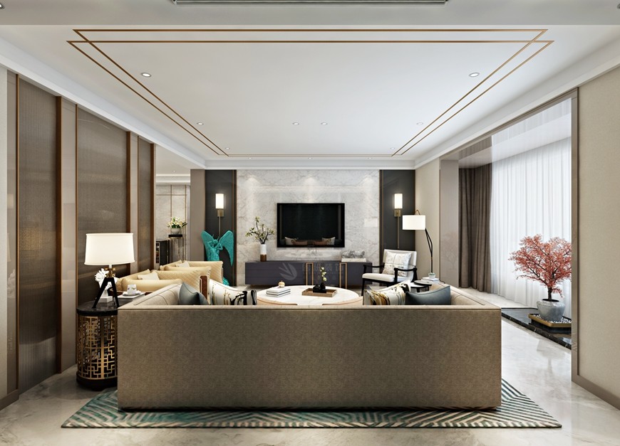 ▲西安(ān)魯班裝(zhuāng)飾出品湖(hú)城大境八号地天錦230平米現代簡約風馬超設計師主筆(bǐ)設計方案一——客廳沙發背景牆設計效果圖