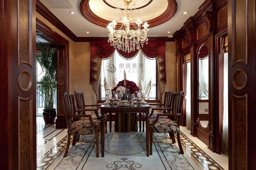 ▲中(zhōng)海東郡聯排别墅古典歐式360平米李建明主筆(bǐ)設計——餐廳設計實景拍攝
