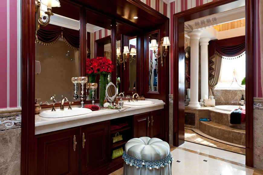 ▲中(zhōng)海東郡聯排别墅古典歐式360平米李建明主筆(bǐ)設計——洗漱室實景拍攝